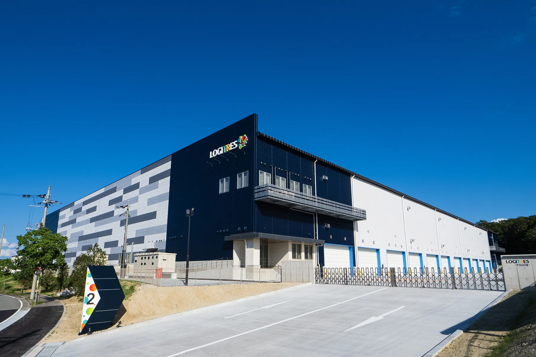 「物を置き、運び出すためだけではない物流施設を」という想いから、合理性よりも、街の景観や利用される方のことを考え、ロジトレスは設計されています。たとえば、地域ごとに異なるデザイン、充実した執務スペース、車椅子の方への配慮から配置されたスロープなど、細部までこだわり抜いた空間設計。荷受けと荷下ろしを同時に可能にする両面バースの仕様や、高い天井高が可能にする収納力も、利用されている企業様からご好評いただいています。