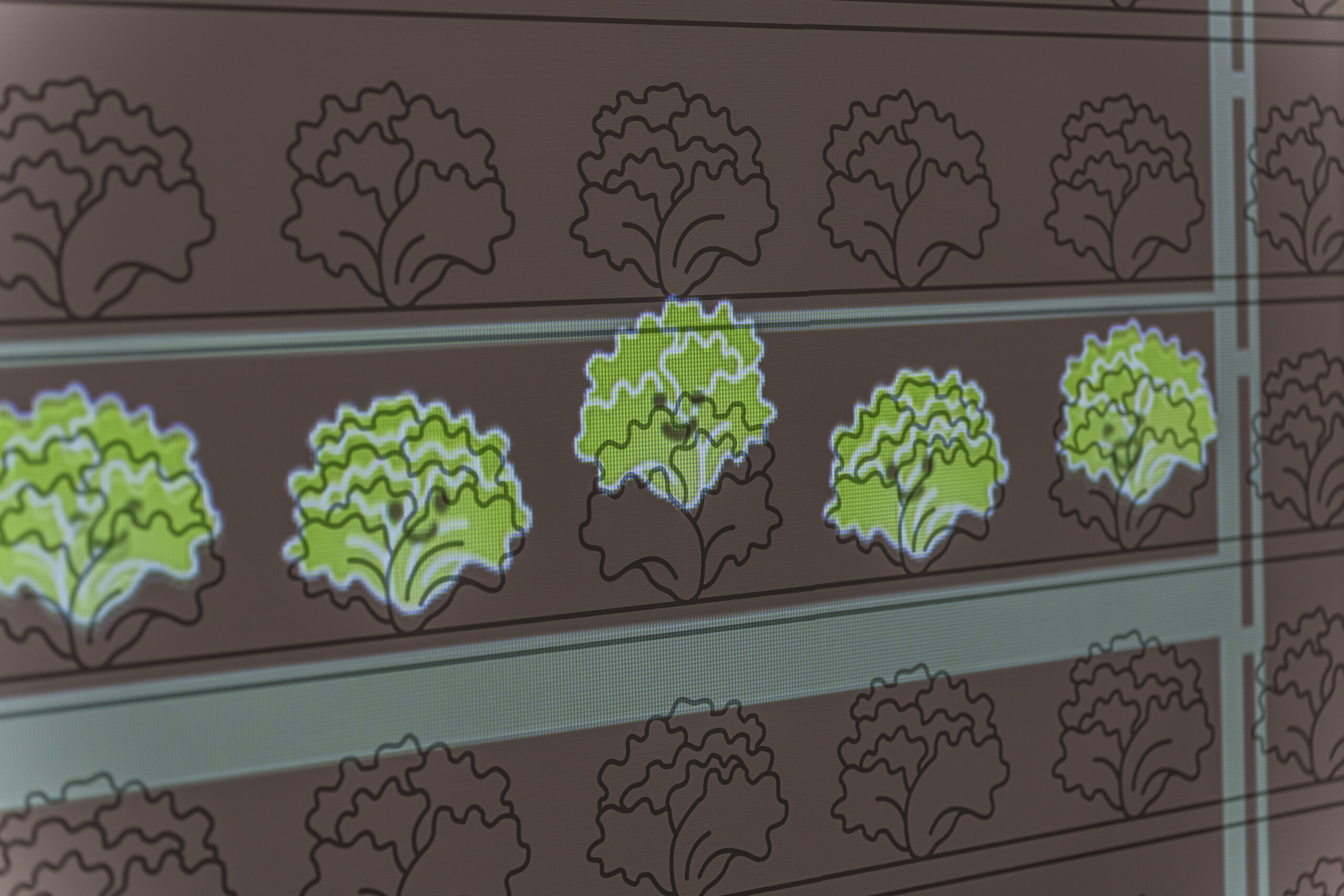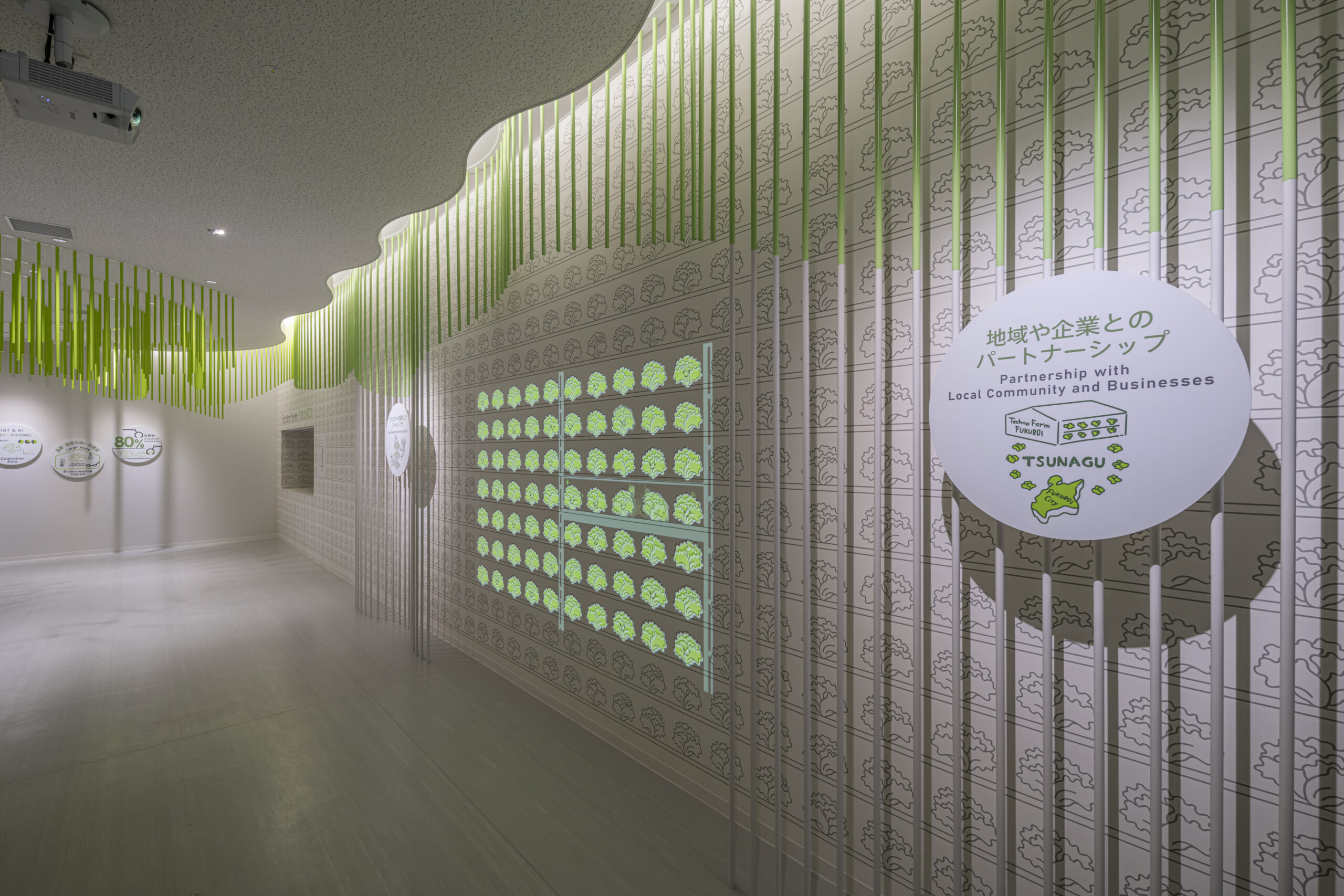 当工場内は機密保護により生産施設の公開範囲が限られているため、見学可能な箇所を小窓から覗く形で限定するほか、壁面に実際のレタスと同じ大きさのグラフィックを描き、大量のレタスが生産エリア内部に整然と並んでいる様子が透過して見えるような演出をしています。