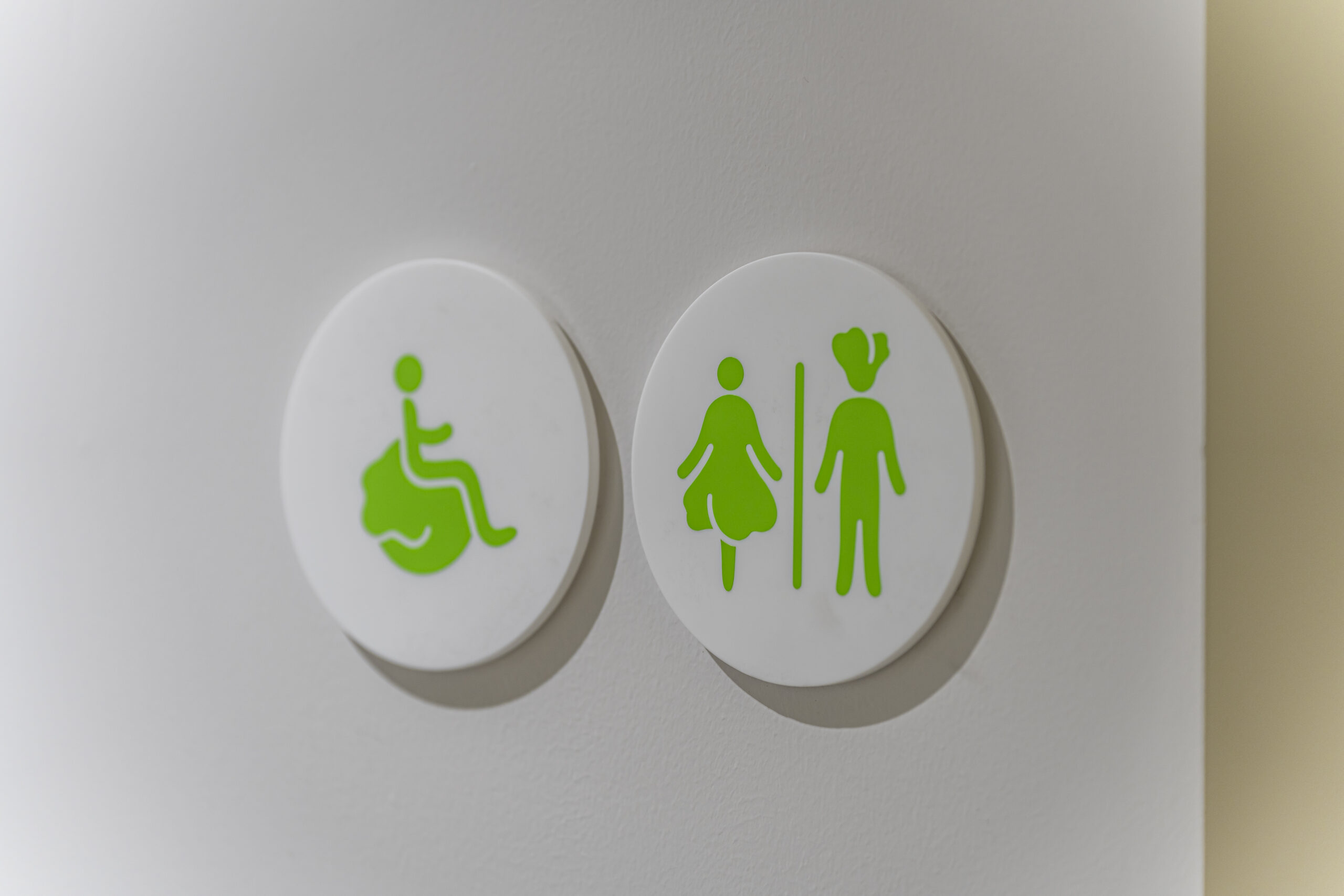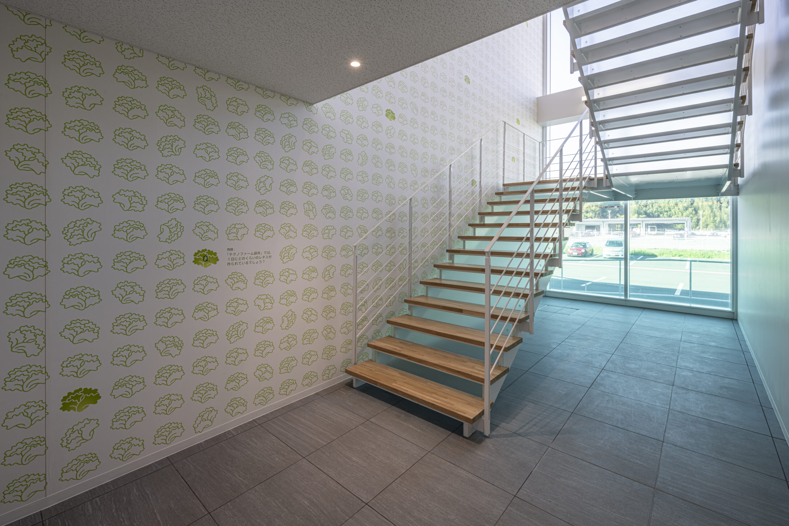 1階から2階へ上がる階段の壁面には、レタスのグラフィックと共にクイズを掲示し、2階にたどり着いたときに答えが明かされる仕組みとするほか、トイレのピクトサインはレタスをモチーフとしたデザインにし親しみやすくしました。また見学通路では、壁面のグラフィックとシンクロさせたアニメーションを投影することで、自動化された生育過程をわかりやすく伝え、子供たちが楽しめるよう工夫しています。
