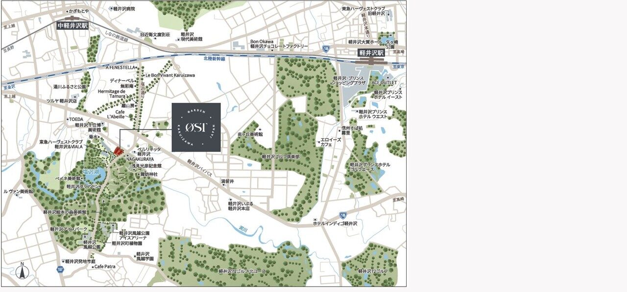 当物件は、JR北陸新幹線「軽井沢」駅まで車で約10分の場所に位置しており、周辺は洗練された多種多様なレストランや、美術館等の芸術施設の揃う充実したロケーションです。