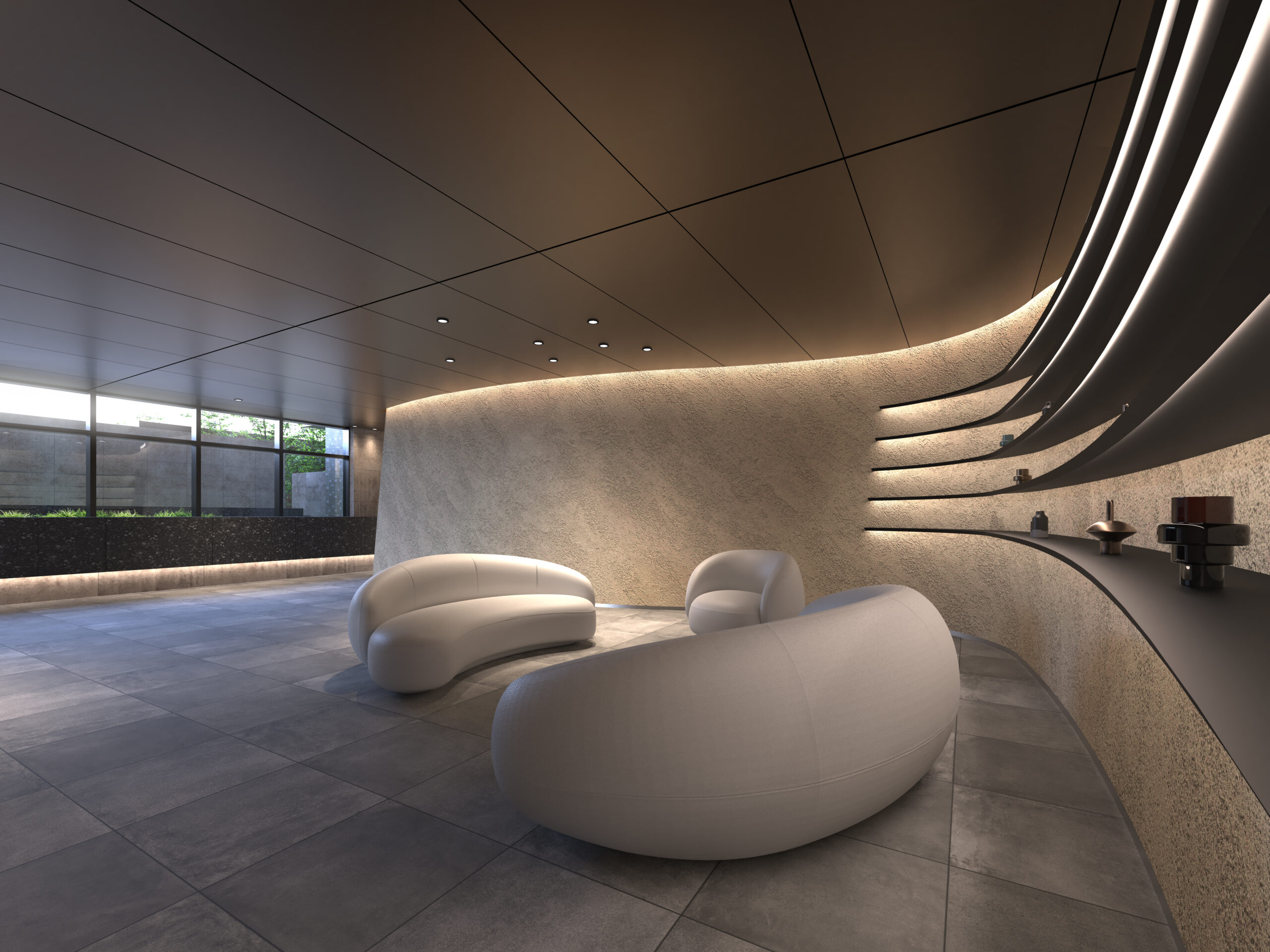 共用部は、曲線美を纏った内部のエントランスホールに、優美なカーブを描くソファを配置することで、住まう人、訪れる人すべてに心休まる豊かな空間を提供します。