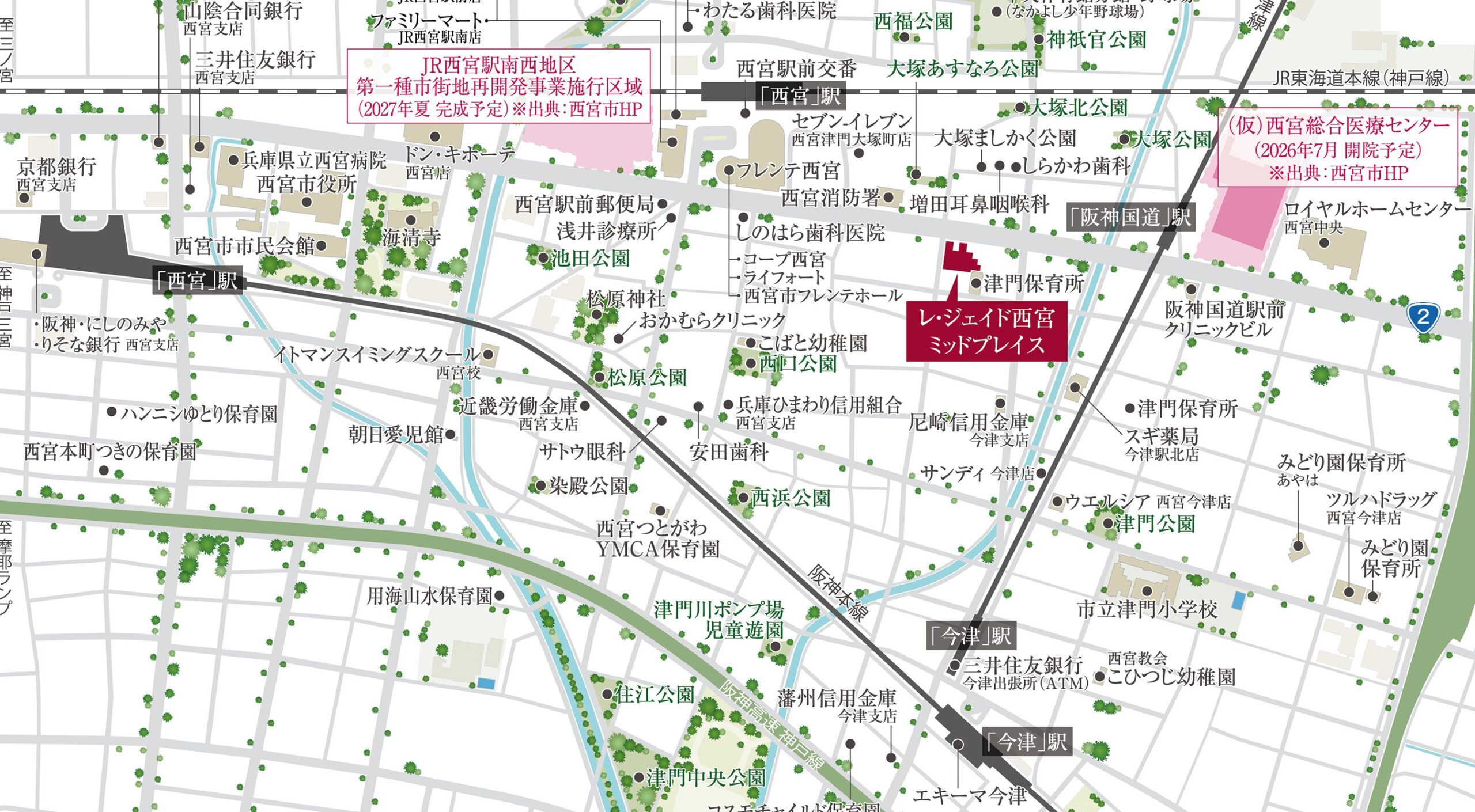当物件は、スーパーや専門店などが入居するショッピングモール「フレンテ」から徒歩4分の場所に位置し、少し足を延ばせば「阪急西宮ガーデンズ」も利用可能な買物利便性の高い立地です。また、総合病院や「西宮地方卸売市場(愛称:おろいち)」などが開業する「JR西宮駅南西地区第一種市街地再開発事業施行区域」(2027年夏完成予定※2)に近接しており、今後の発展が見込めるエリアです。