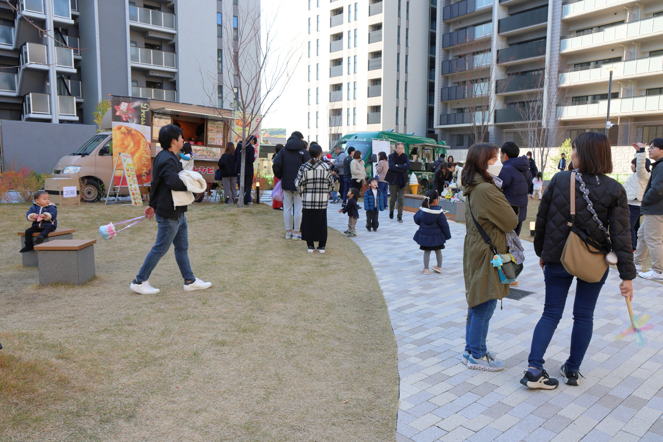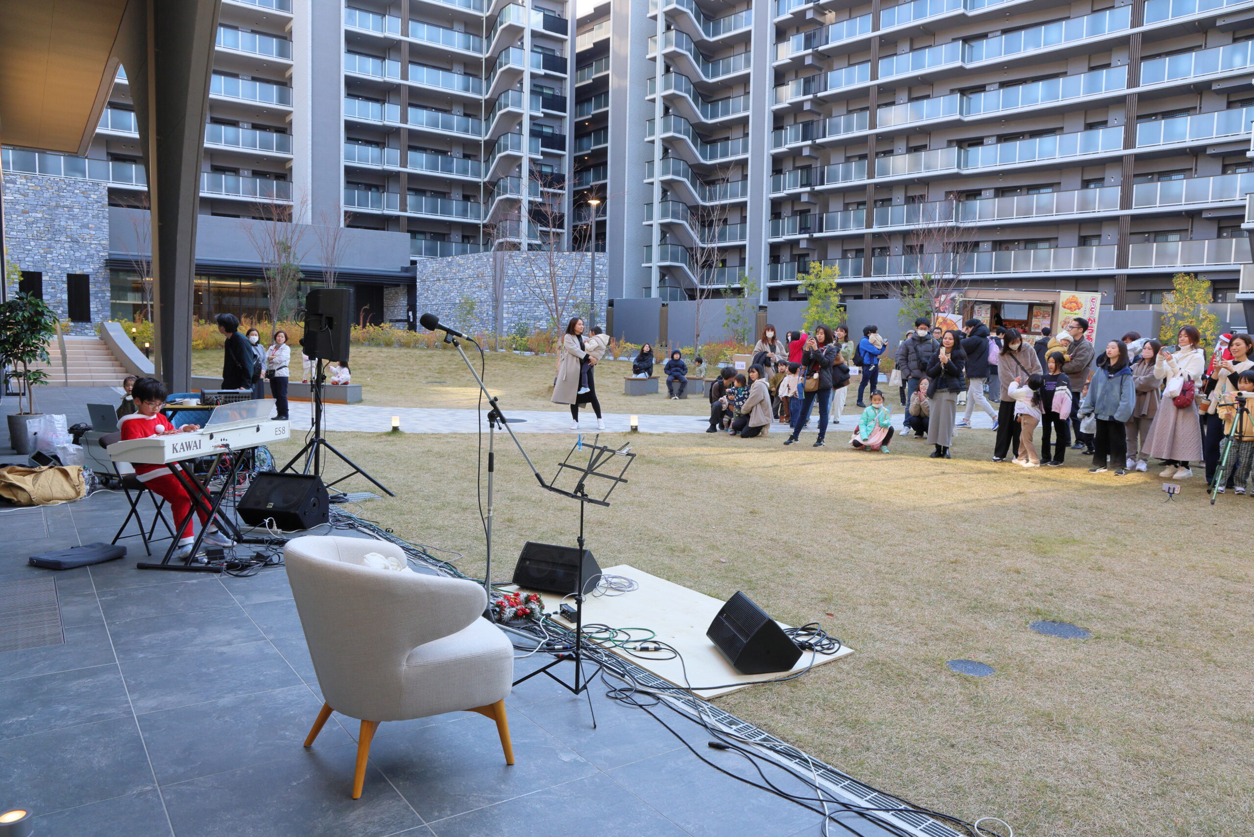 当イベントでは、「MUSIC LIVE」「KITCHEN CAR & FOOD」「WORK SHOP & GAME」の3つのプログラムを展開し、大いに賑わいました。「MUSIC LIVE」では、プロのアーティストをお招きしたほか、当街区にお住いの方々が出演し、歌や楽器、ダンスなどが披露され、会場を盛り上げました。「KITCHEN CAR & FOOD」では、キッチンカーとフードマルシェにて多彩な食事やドリンクが提供され、体験型ワークショップや雑貨販売、ボードゲーム大会が開催された「WORK SHOP & GAME」は、住民同士の幅広い交流の場となりました。