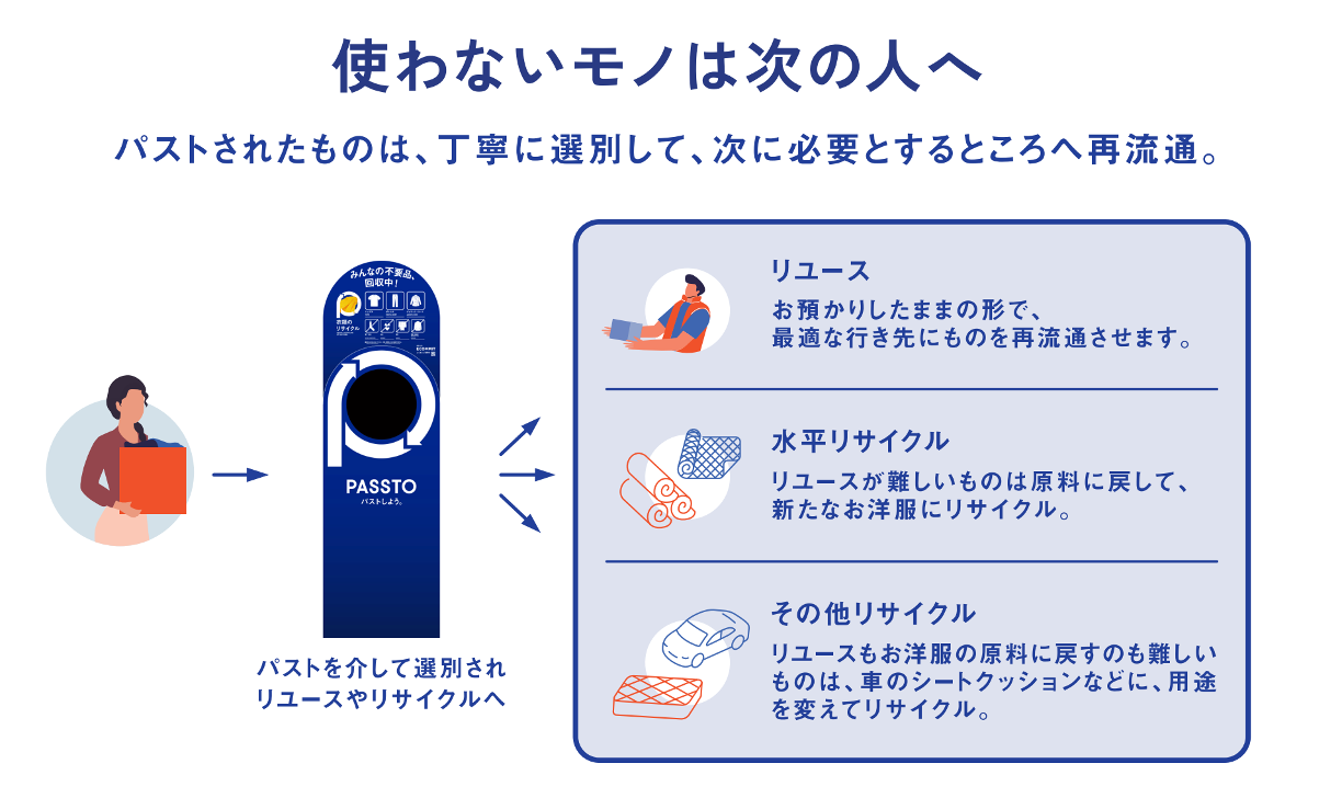 「PASSTO」は、“PASS TO”を短縮した造語で、「次の人に渡す・未来につなぐ」を意味しています。生活者の身近な場所で資源循環の入口となり、不要品の回収から選別、再活躍させるリユース・リサイクルまでの一連の循環モデルを提供しています。衣類のリユース・リサイクル率は約98%を誇り、単純焼却と比較してCO2排出量の削減にも貢献。資源が循環する社会づくりを推進しています。