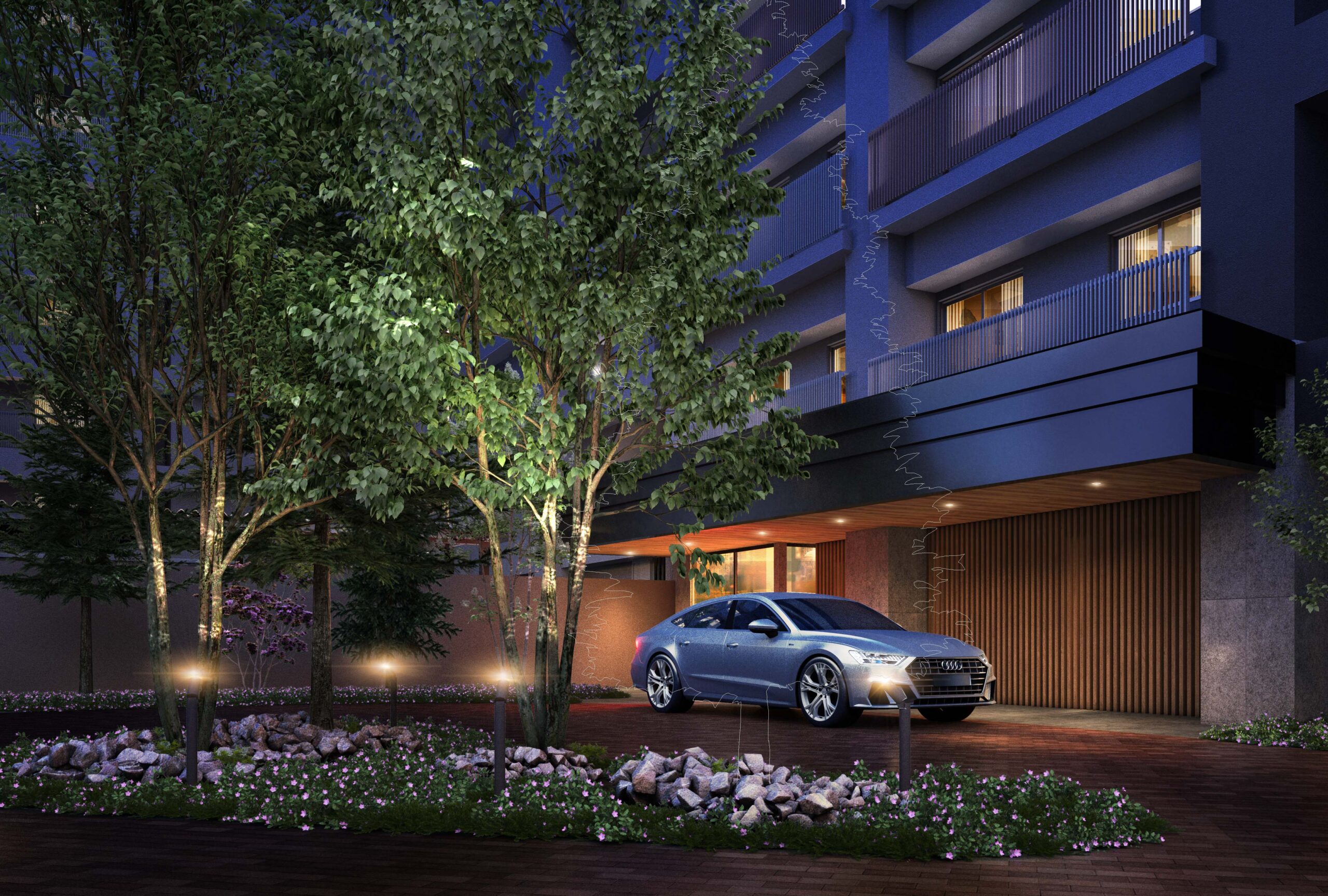 共用部は、メインエントランスのほかに、車寄せを備えたサブエントランスを設けることで歩車分離を行っているほか、住戸に対して100%の設置率※1となる駐車場を確保し、カーライフの利便性を高めました。また、2層吹き抜けの広々としたラウンジには、帯広の土地を想起させるアートを配置し、美術館を彷彿とさせるくつろぎの空間を創出しています。