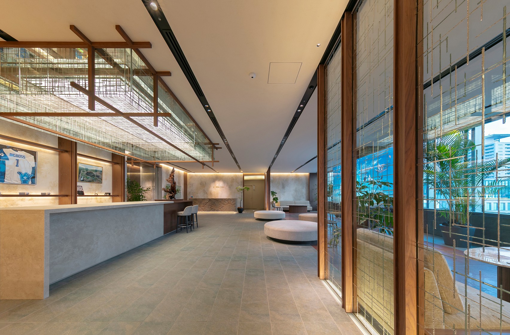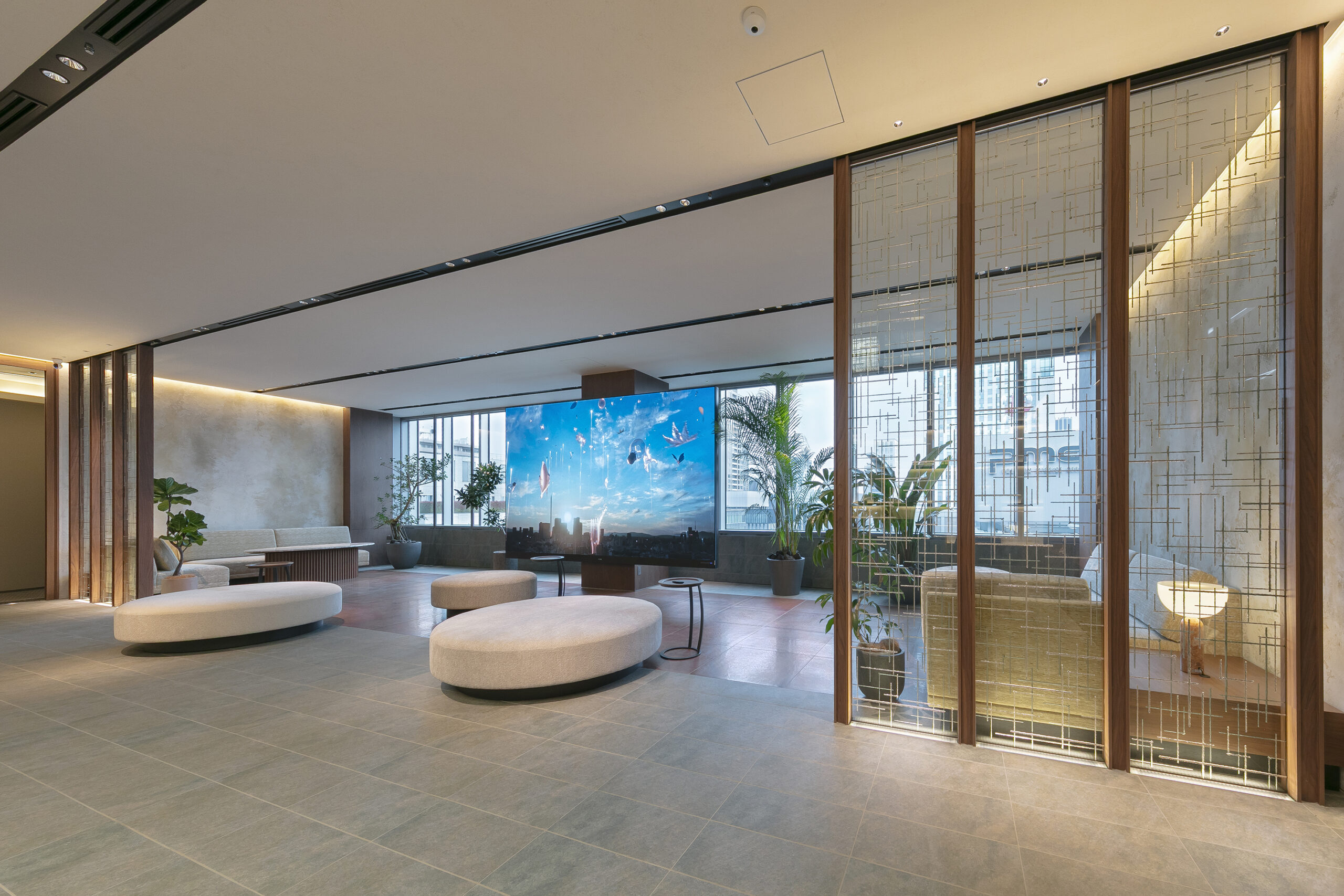 エレベーターホール正面にある重厚なエントランスホールの先には、180インチの大型LEDビジョンを設置した開放的なロビーがお客様をお迎えします。