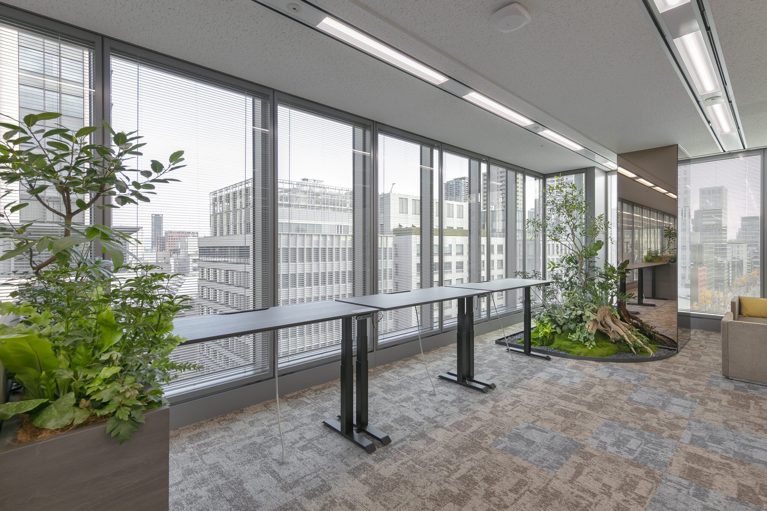 また、社員の健康に配慮した昇降デスクの導入やプライバシーを確保したWEB会議ブースや個人作業のための集中ブースの拡充により、生産性の最大化を図ります。